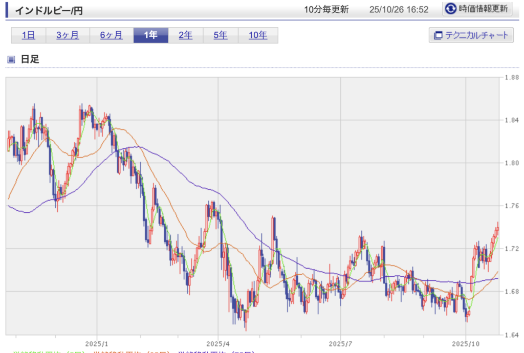 また、コロナショックや、リーマンショックなど、世界的経済危機が起こる場面では混乱の中新興国通貨は売られることが多く、ルピーもコロナショックの際は売られていました。