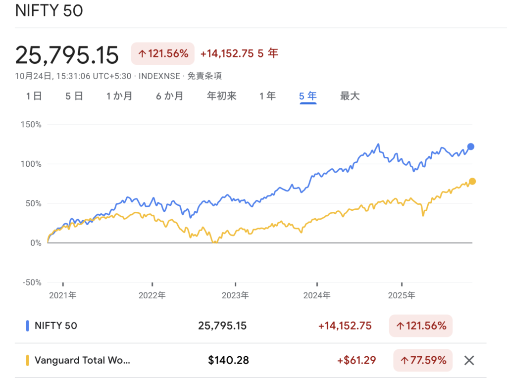 全世界株式のリターン(5年)が約77%ですので、インド株式は、全世界株式のリターンを大きく上回っていることが上の図から分かります。
